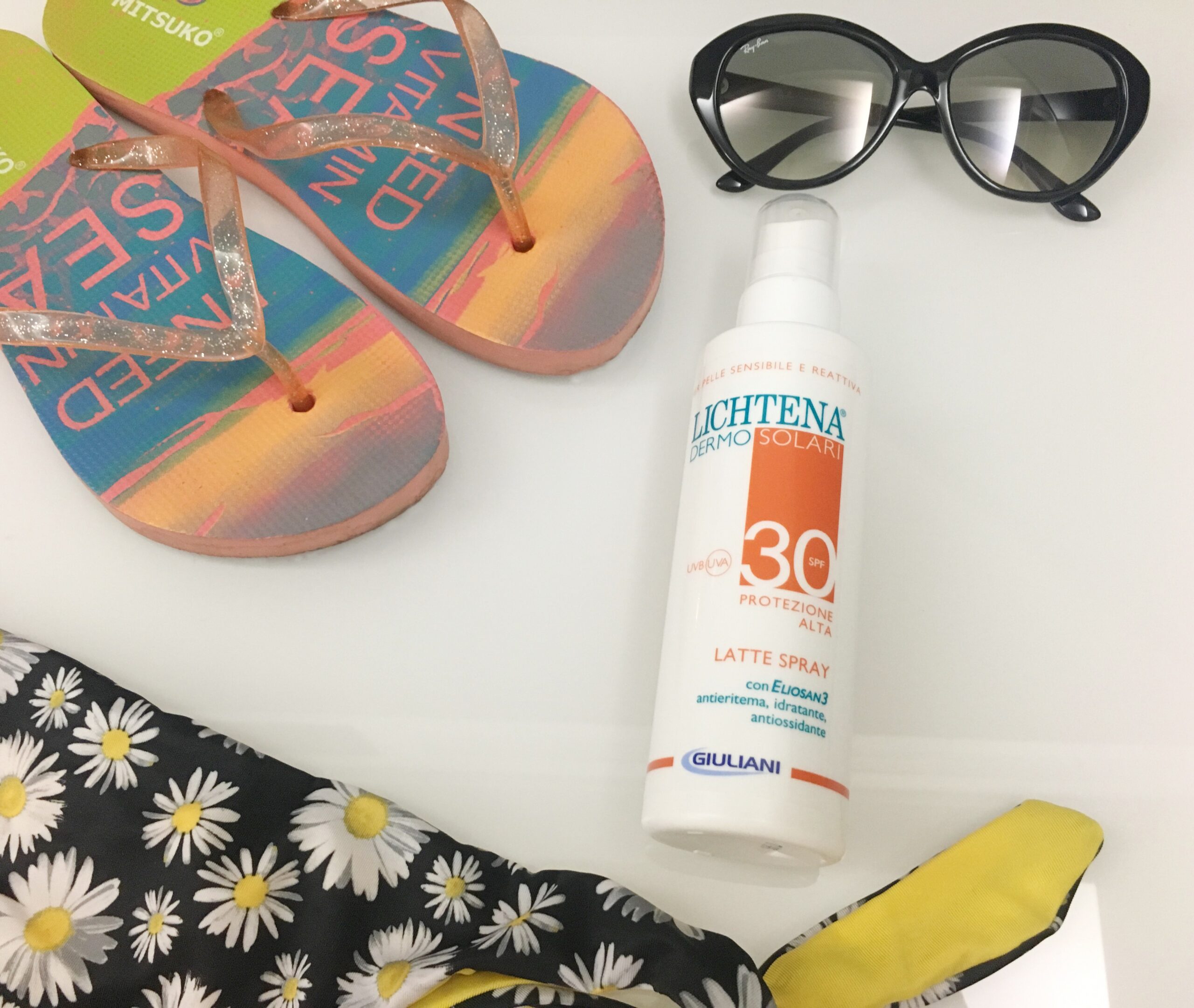 Io ultimamente sto utilizzando un latte spry Lichtena® DermoSolari con protezione alta (spf 30), con Eliosan3 triplazione ed perfetta per chi come me ha la pelle sensibile e reattiva.