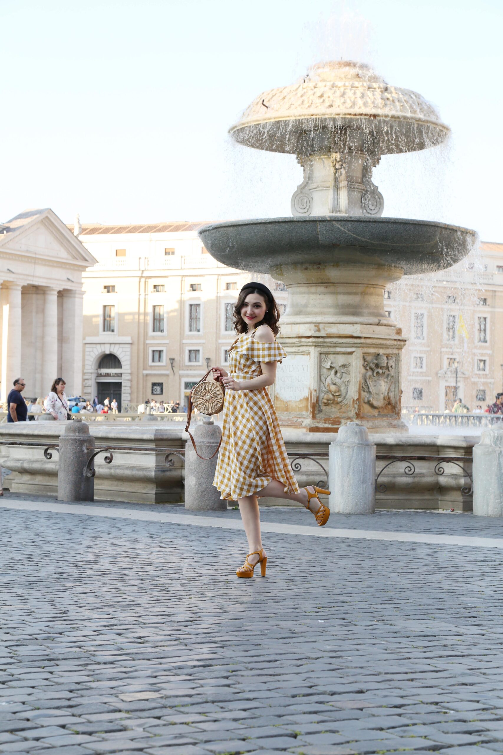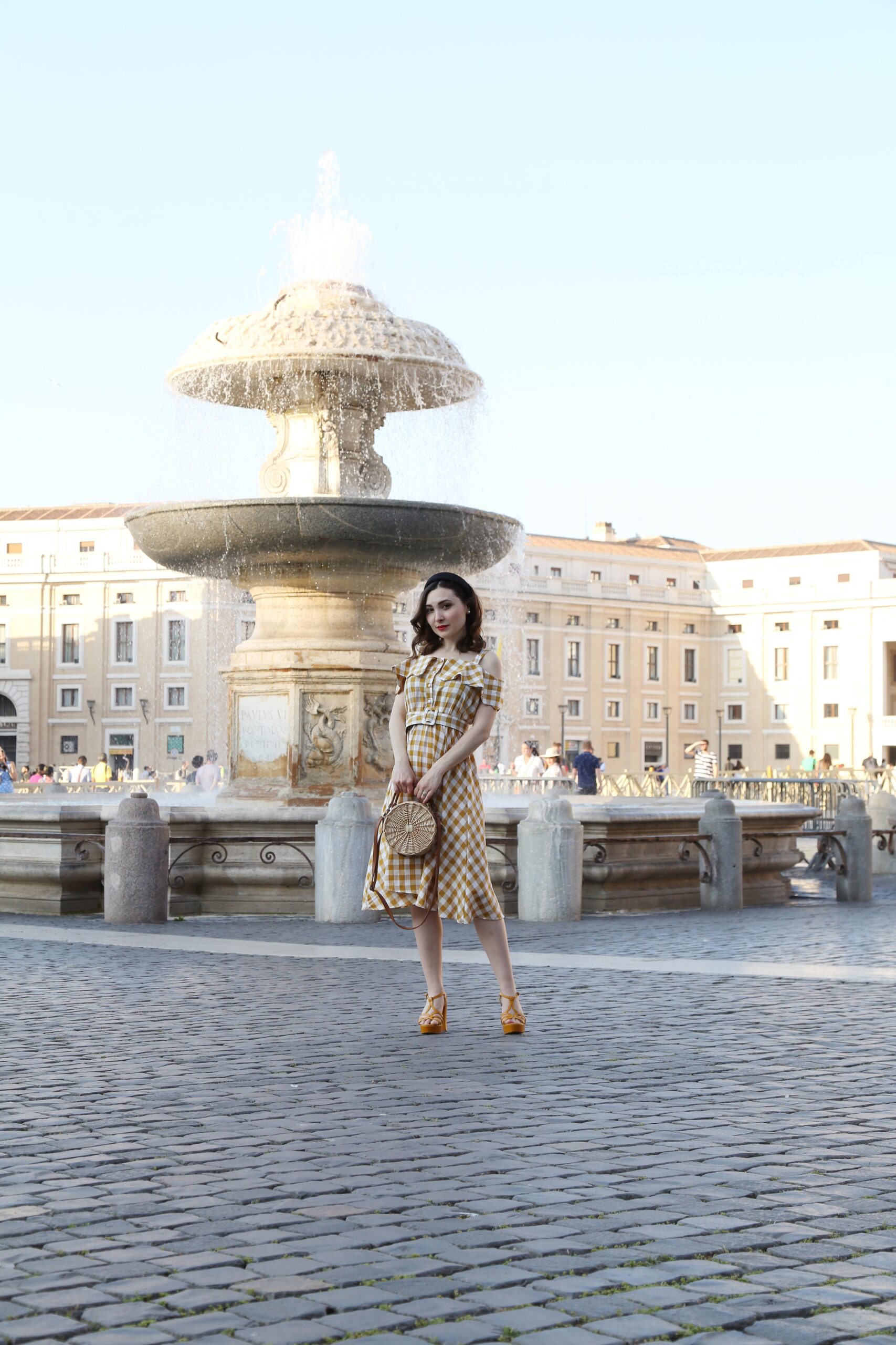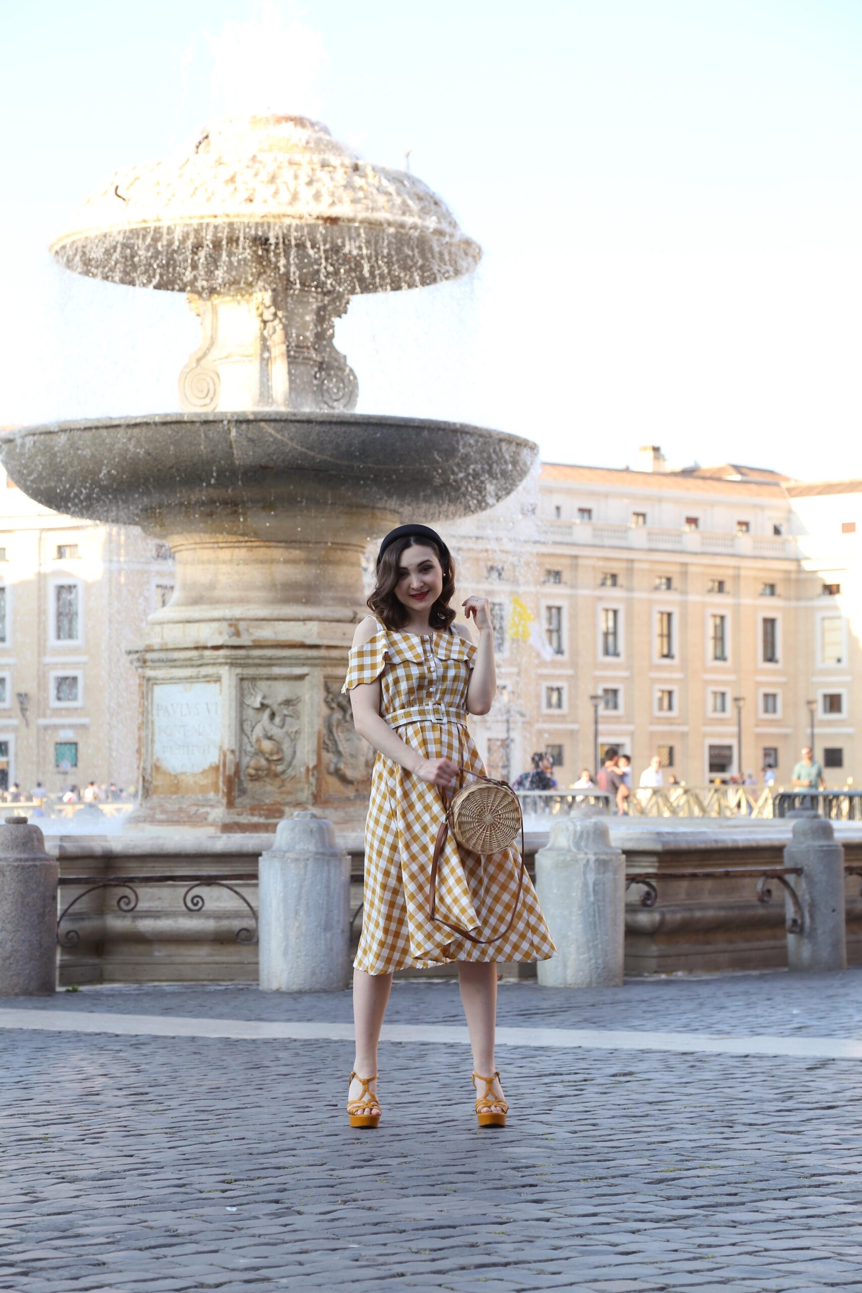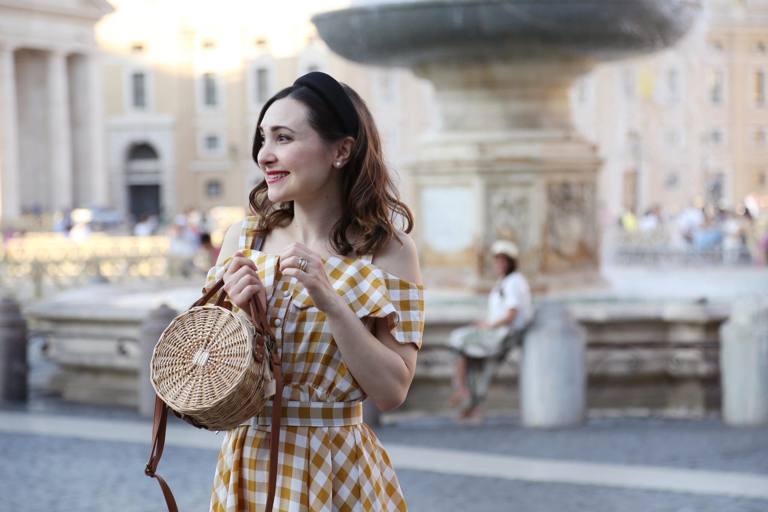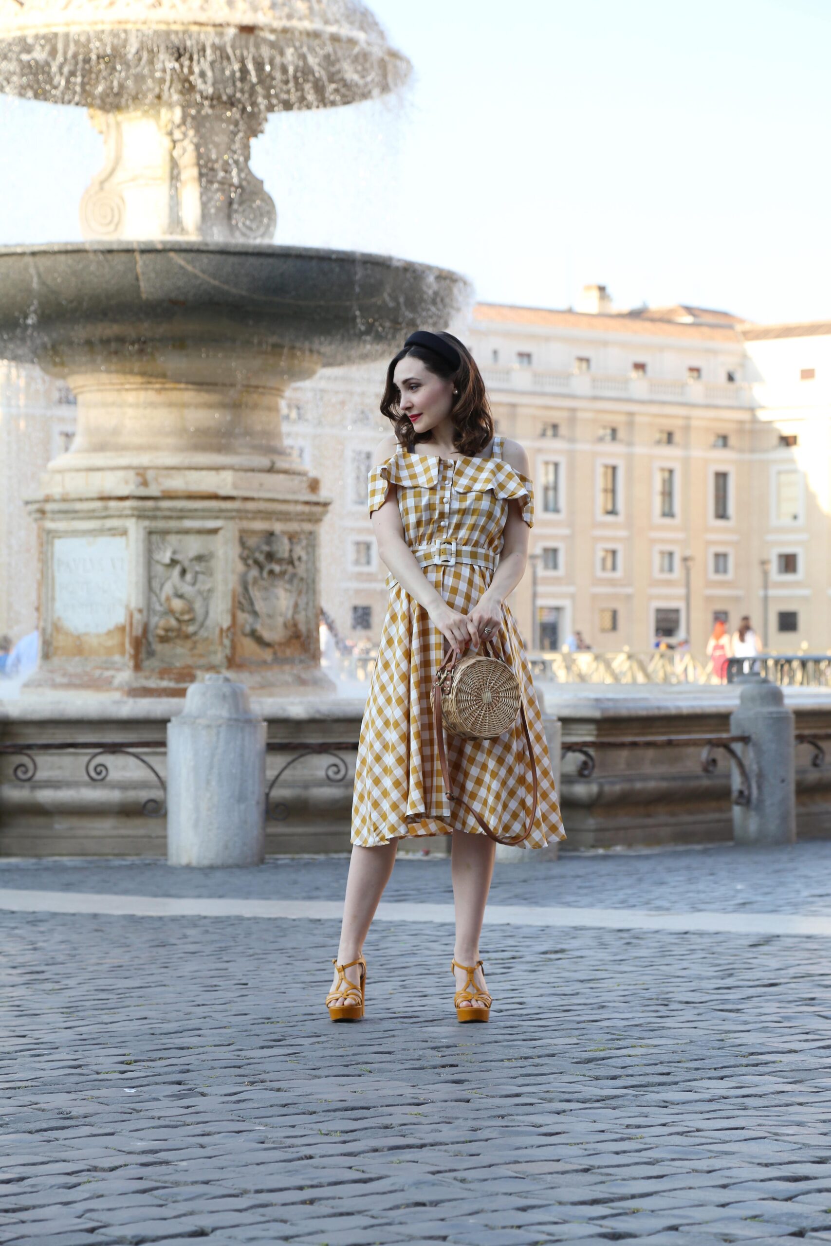 Un paio di giorni fa ho indossato il vestito che vedete in foto. Un adorabile midi dress in stile anni ’50 scelto su SheIn con quadretti Vichy, color senape. Ho trovato delizioso l’abbinamento con la nuova borsetta rotonda di paglia di Asos. Finalmente posso sfoggiarla. Da quando mi è arrivata, il meteo non sembrava mai adatto.