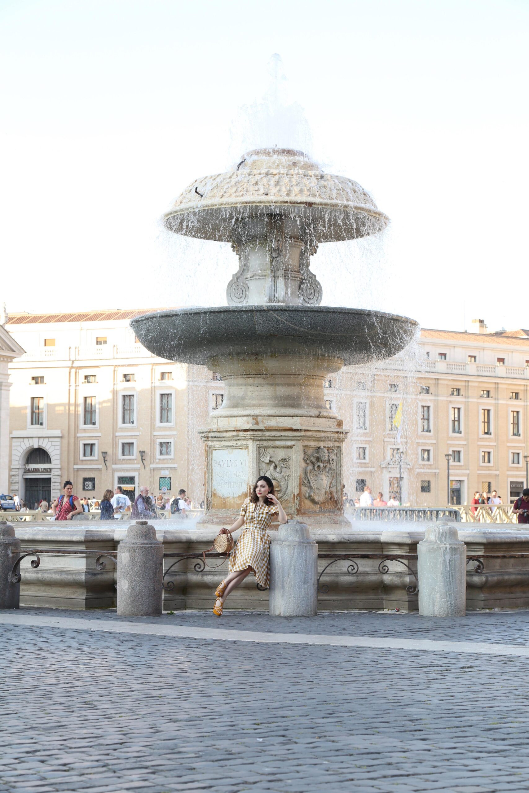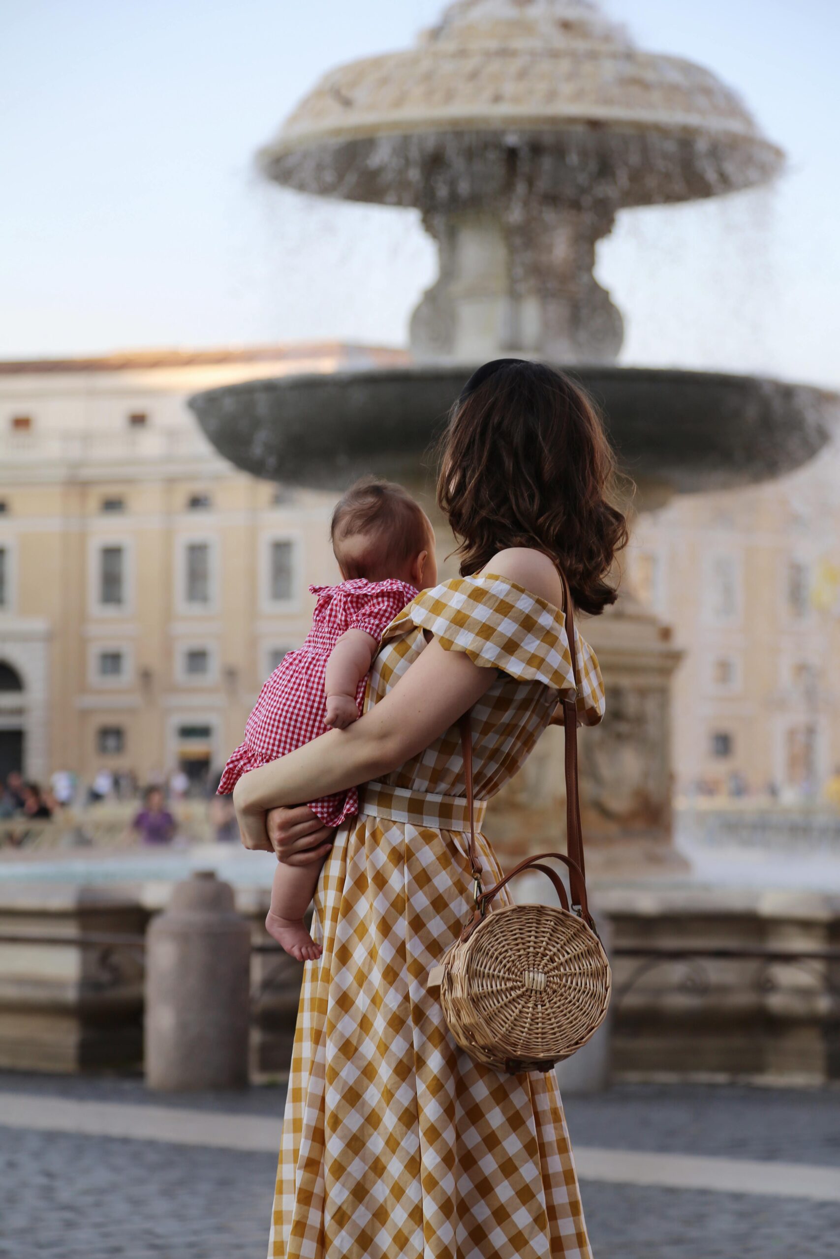Ovviamente la mia piccolina non poteva non indossare un vestitino in stile con il mio, quindi anche per lei un abitino Prenatal con quadretti Vichy, in versione rossa. Ed eccoci a fare la passeggiatina serale, in quel di San Pietro, a giocare a fare le modelle davanti una fontana. Ci ha raggiunte anche Francesco, di ritorno dal lavoro e posso dire che quello è uno dei momenti che preferisco della giornata. Quando ci ritroviamo tutti insieme.