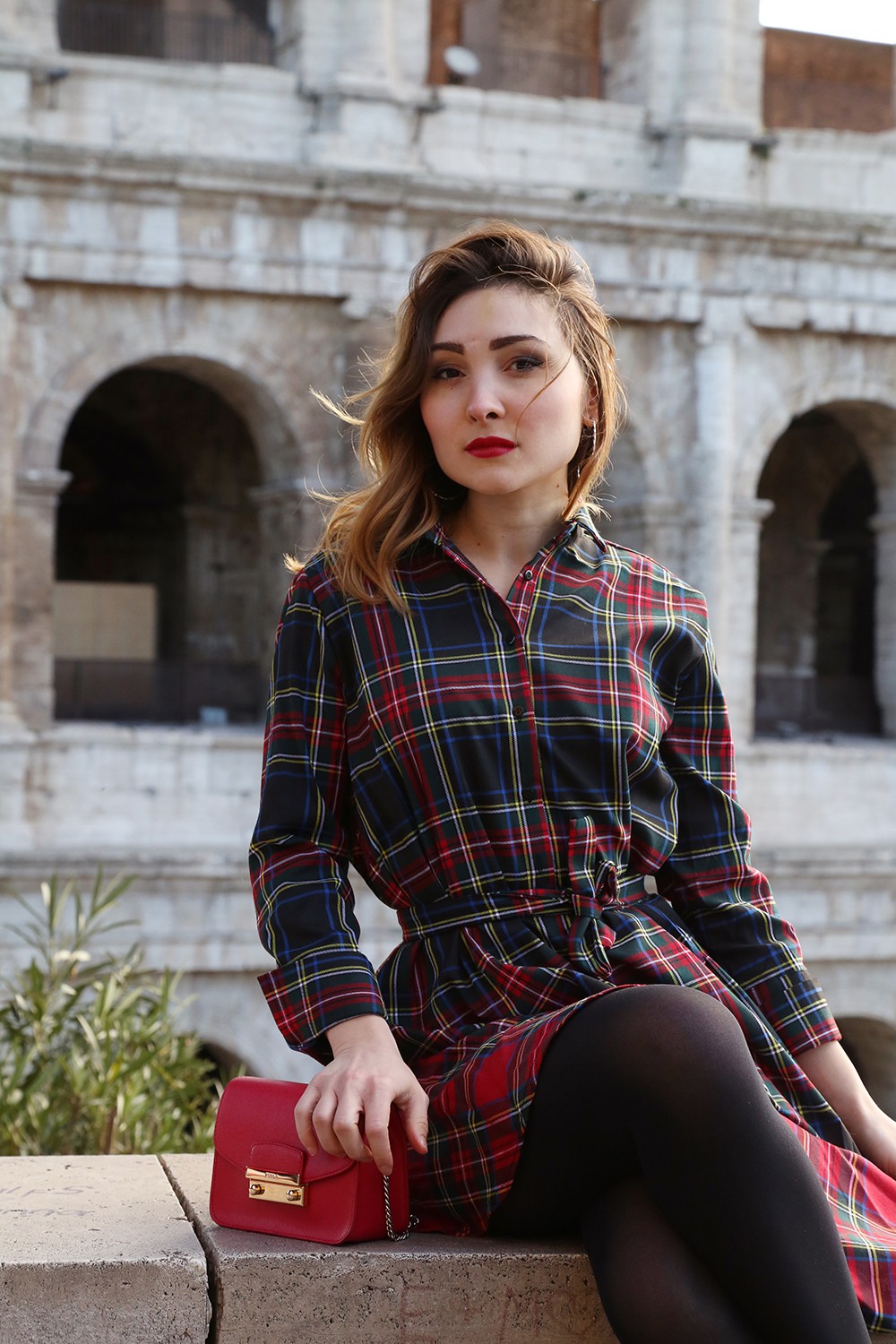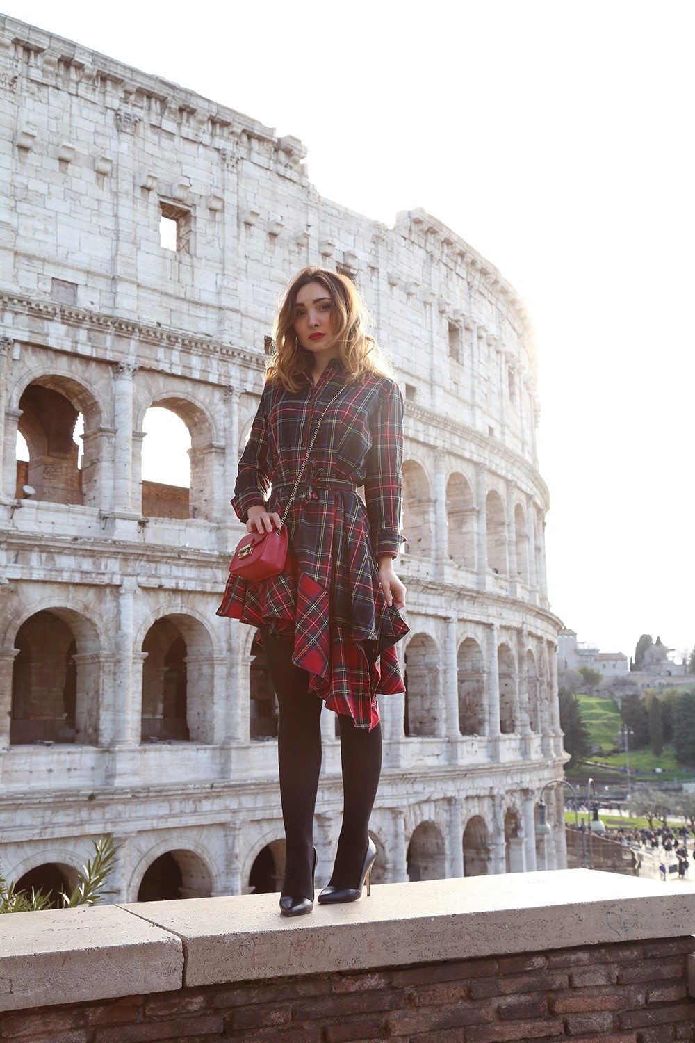 Ho approfittato della meravigliosa passeggiata in centro nel quartiere Monti, fino ad arrivare al Colosseo per scattare qualche foto e mostrarvi il mio outfit. Spero vi piaccia. Fatemi sapere voi come indossereste il tartan scozzese. 😀