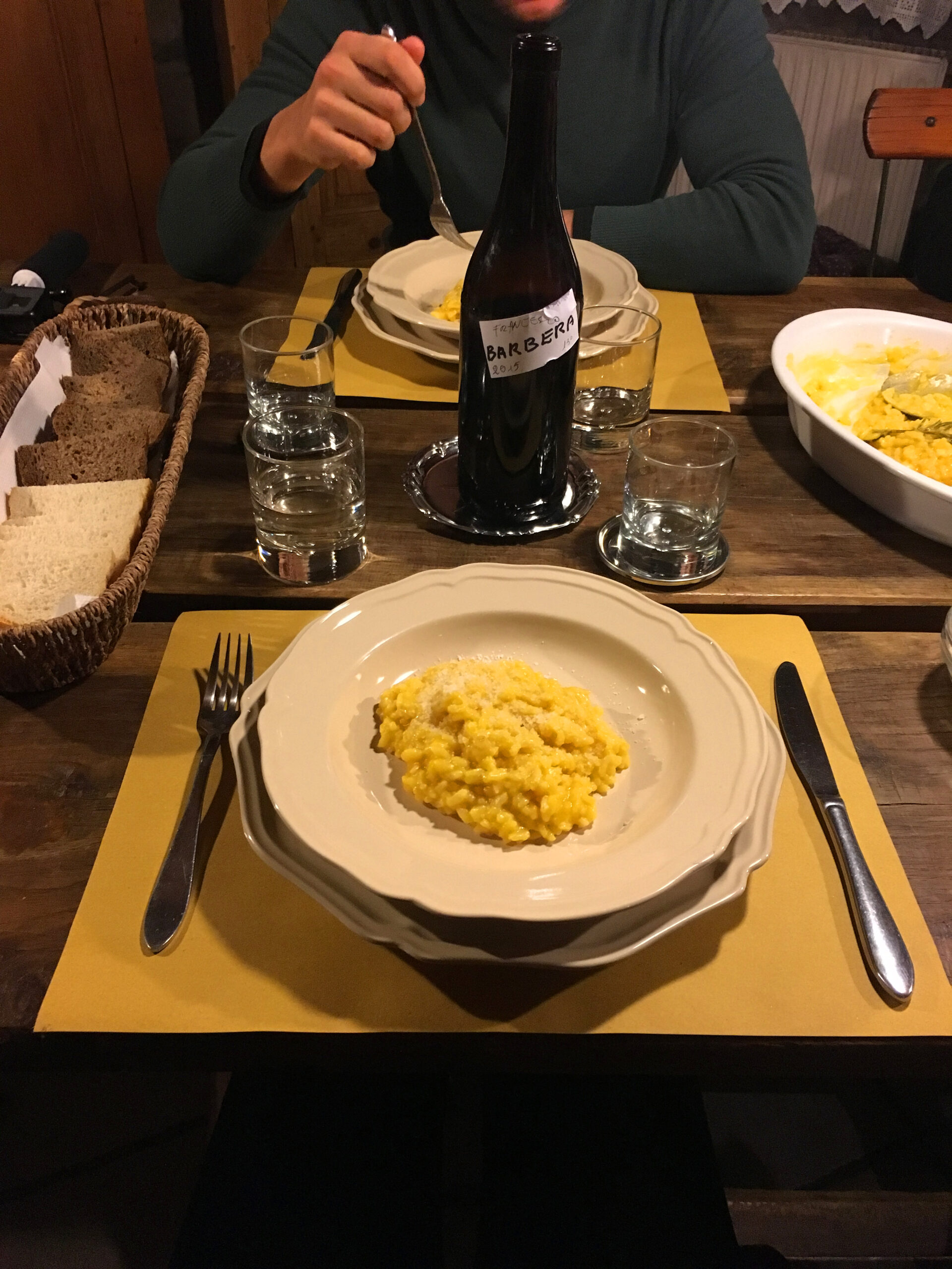 Ceniamo con un piatto tipico preparato da Rosanna, la focaccia con il formaggio e mangiamo su un lungo tavolo di legno con il camino che scricchiola e scalda la sala. Un’atmosfera da sogno.