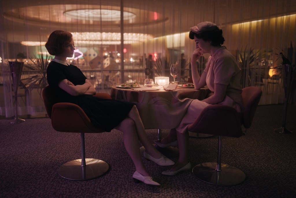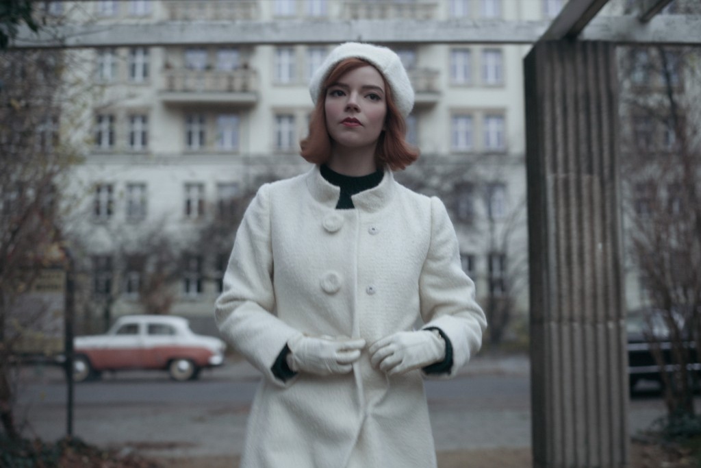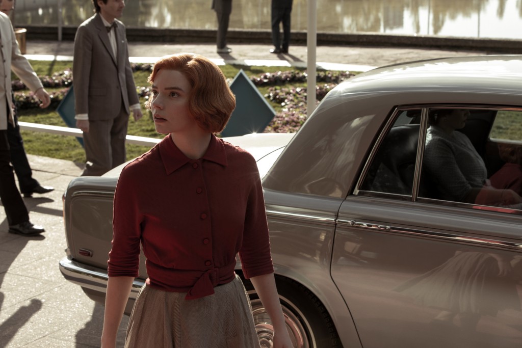 La protagonista Beth Harmon – genio degli Scacchi – ci trascina in un bellissimo viaggio della moda dalla fine degli anni ’50 con gonne midi e camicette dai colletti particolari, fino all’inizio degli anni ’70 con foulard tra i capelli. I costumi sono stati scelti e curati con estrema attenzione per il dettaglio. Nulla è stato lasciato al caso, dagli abiti alle acconciature, senza dimenticarci ovviamente del make up.