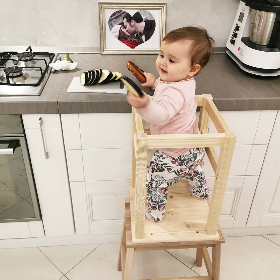 Buongiorno ragazze, oggi vi parlo di uno strumento molto utile nella mia vita di mamma : la torretta Montessoriana (o Learning Tower). Isabelle adesso ha dieci mesi ma già da diverso tempo partecipa alle attività di casa, si incuriosisce delle faccende domestiche, del cucinare o del mio lavoro. O delle fasi di montaggio dei mobili per la casa. E’ cresciuta in fascia, cullata dai miei passi e coccolata dalla mia voce. In questi mesi ha osservato tutto e credo anche imparato molto. Ultimamente però il suo peso e le sue dimensioni hanno cominciato ad essere un po’ proibitive per l’uso costante della fascia, soprattutto tutte le volte che dovevo piegarmi ed avevo bisogno di libertà di movimento. Per questo mi sono spesso trovata costretta a non poterla tenere in braccio durante le routine quotidiane, ad esempio mentre cucinavo. Per ritrovarmela così aggrappata alla gamba e con gli occhi lucidi impegnata ad argomentare le sue ragioni con versetti tenerissimi e ripetendo ‘mamma mamma mamma’. Interrogandomi su come fare mi è tornata in mente la Learning Tower o torretta montessoriana, che avevo scoperto guardando un video addirittura diversi mesi prima della gravidanza.