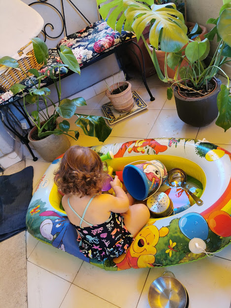 Certo, giocare a mamma e figlia è molto divertente, ma sicuramente lo è di più avere a che fare con cose vere. Impasti, sbattitori elettrici, frullatori e mattarelli. Ancor più divertente poi è dopo aver cucinato insieme lavare le cose che abbiamo sporcato. L’acqua è sicuramente l’elemento di Isabelle, almeno in questo periodo. Farmi aiutare a lavare le cose è per lei fonte di gioia, così come lo è giocare alla fontanella o fare la doccia con me.