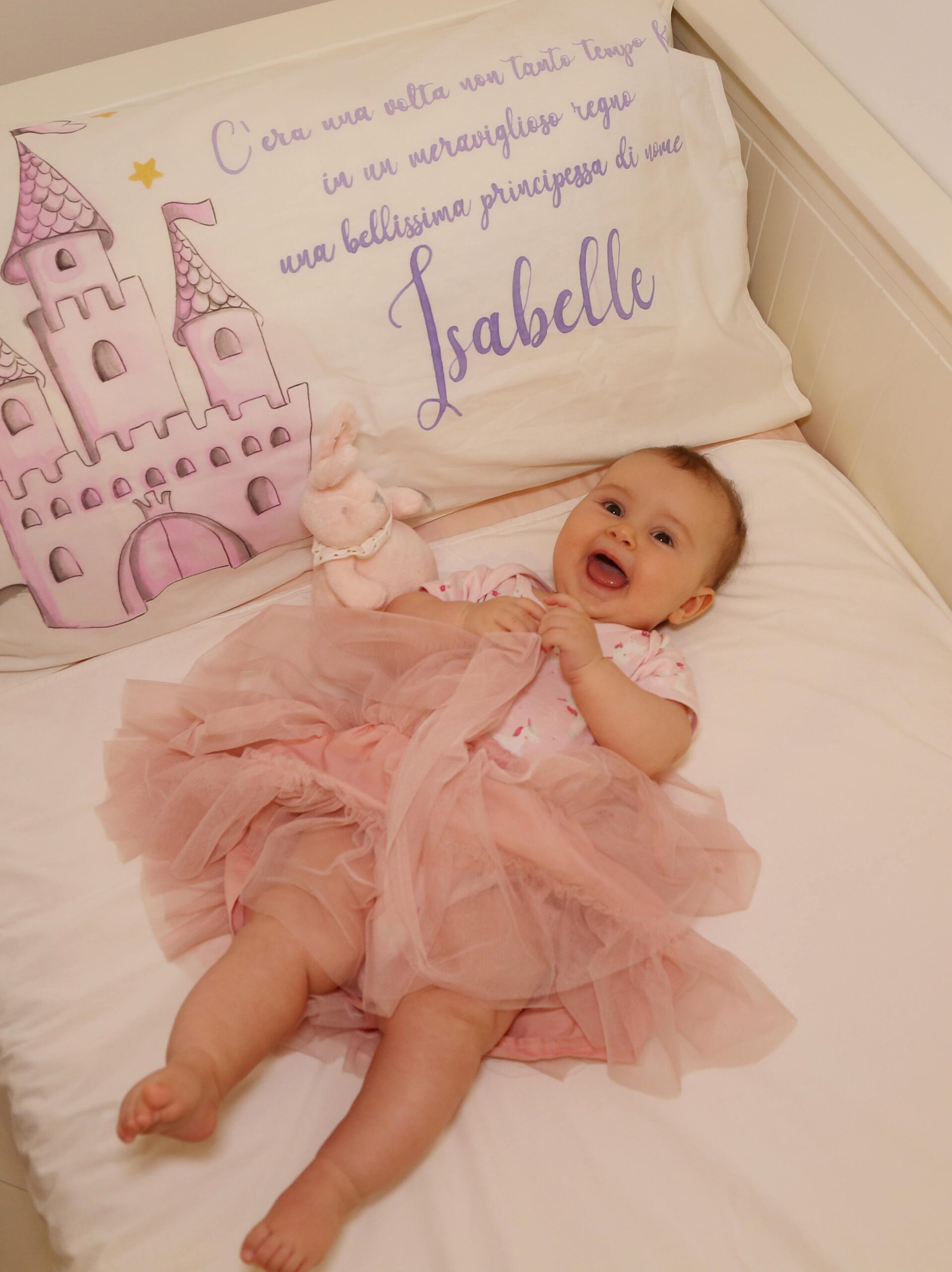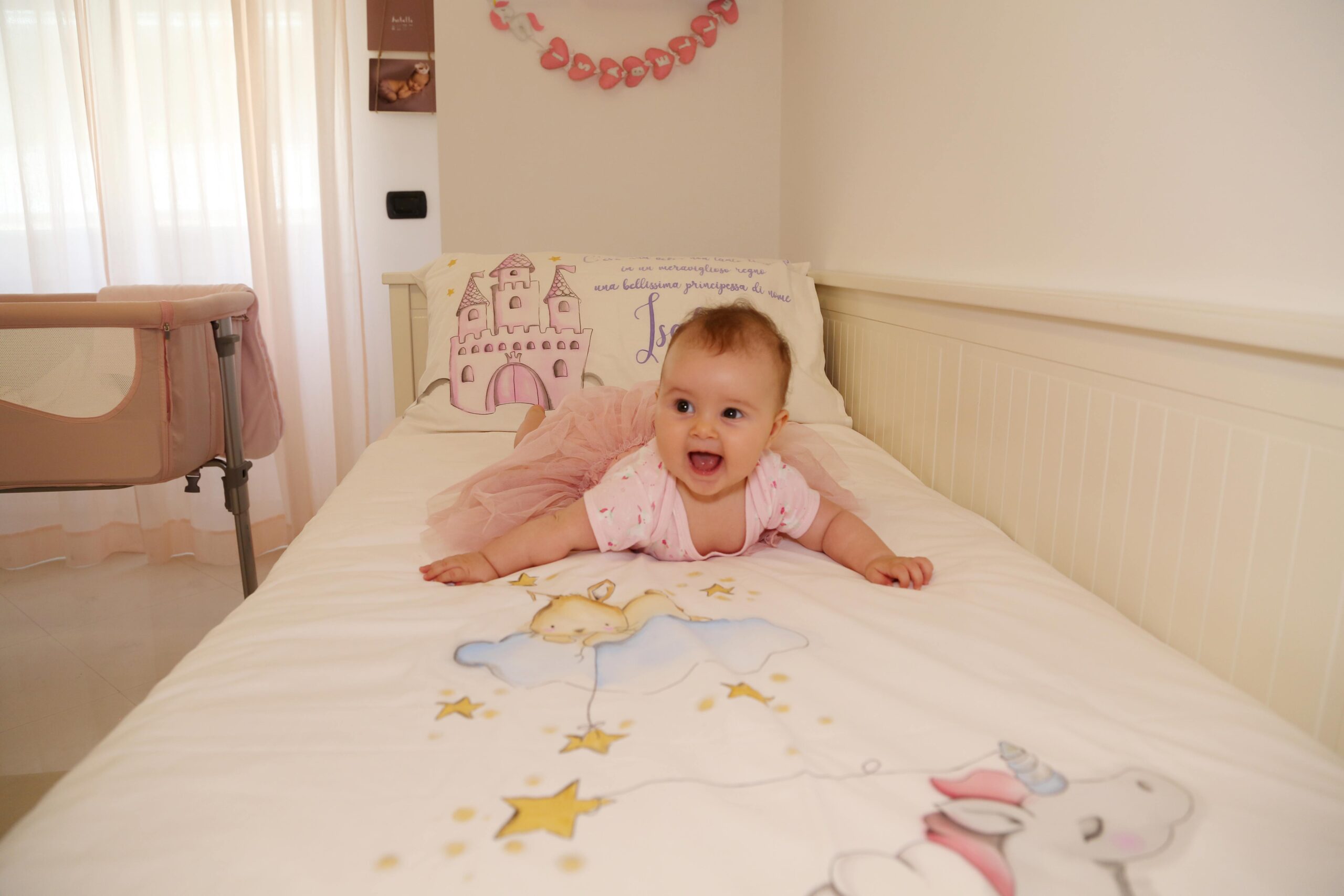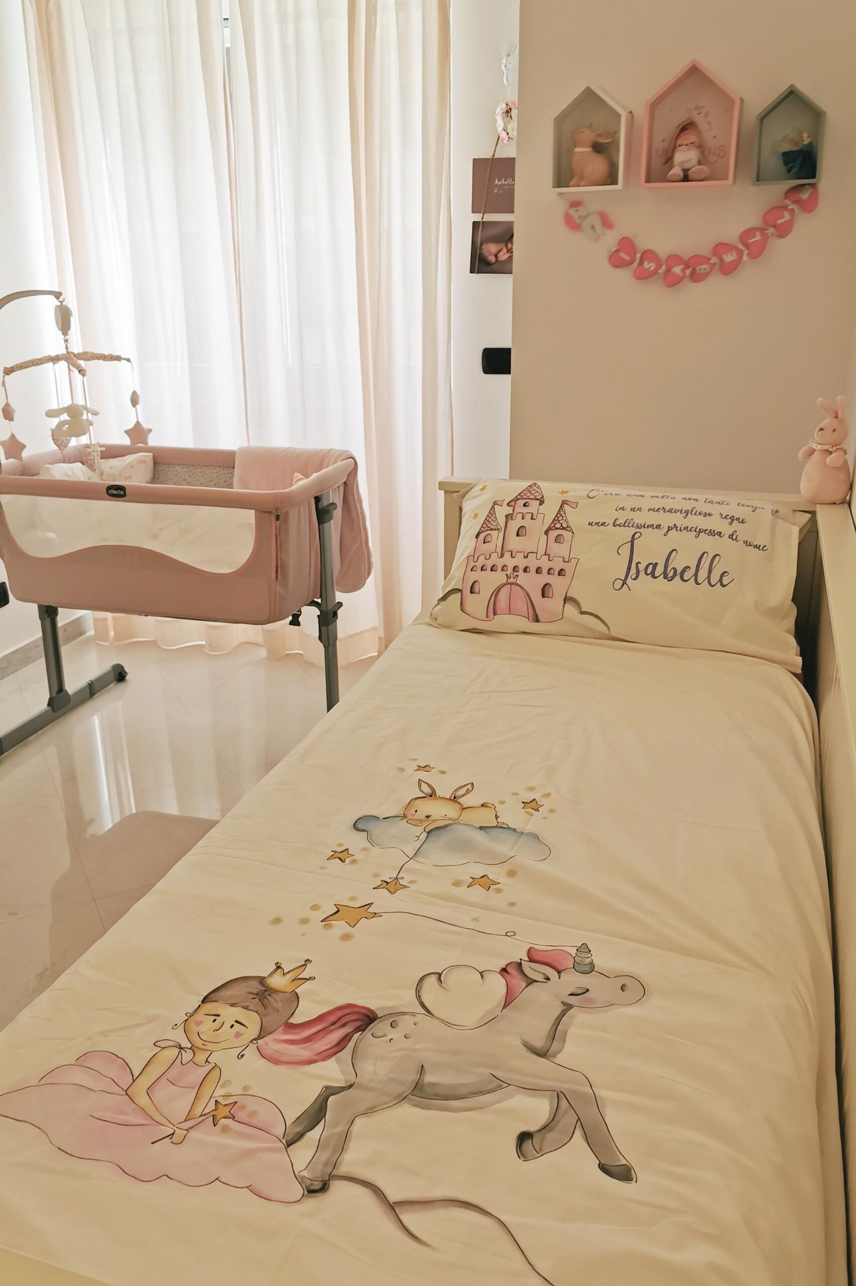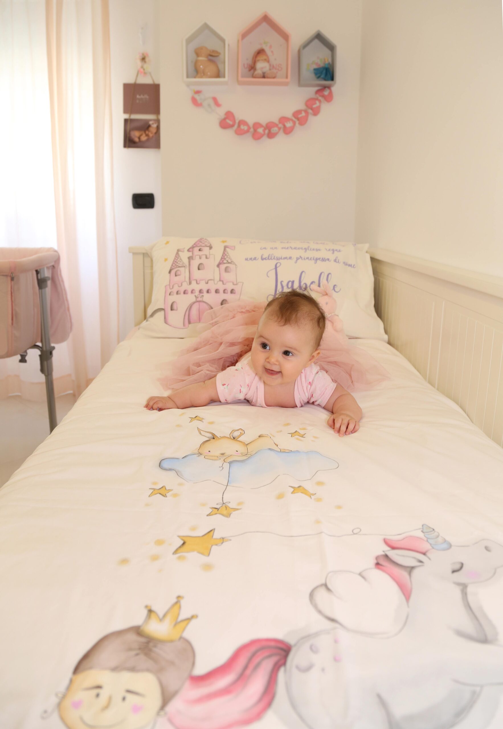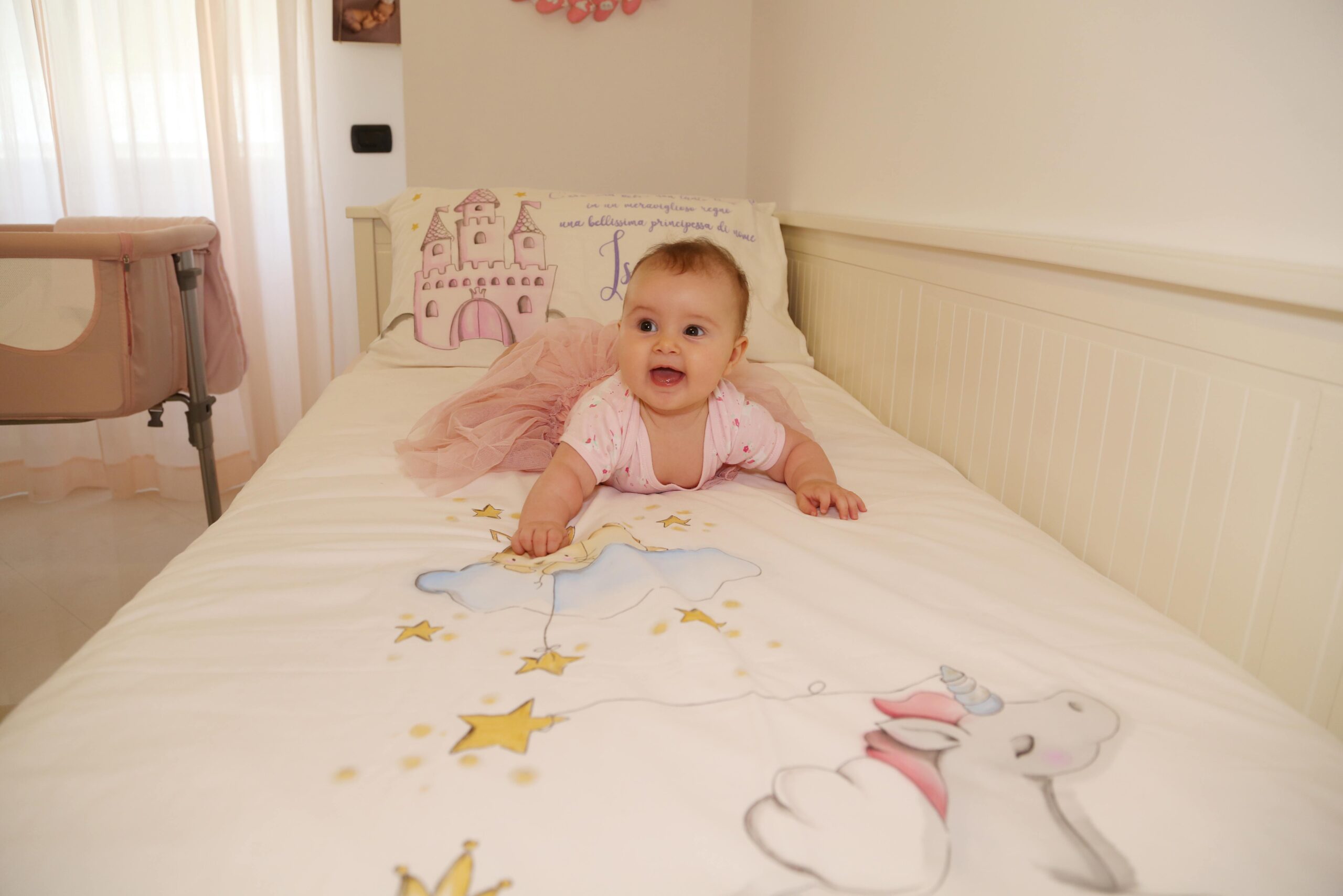 In questo momento sul lettino della cameretta della mia piccola c’è un suo lavoro, un bellissimo lenzuolo dipinto a mano con uno dei temi più amati dalle bambine ” Le principesse”, dove la protagonista è la mia sorridente Belle.