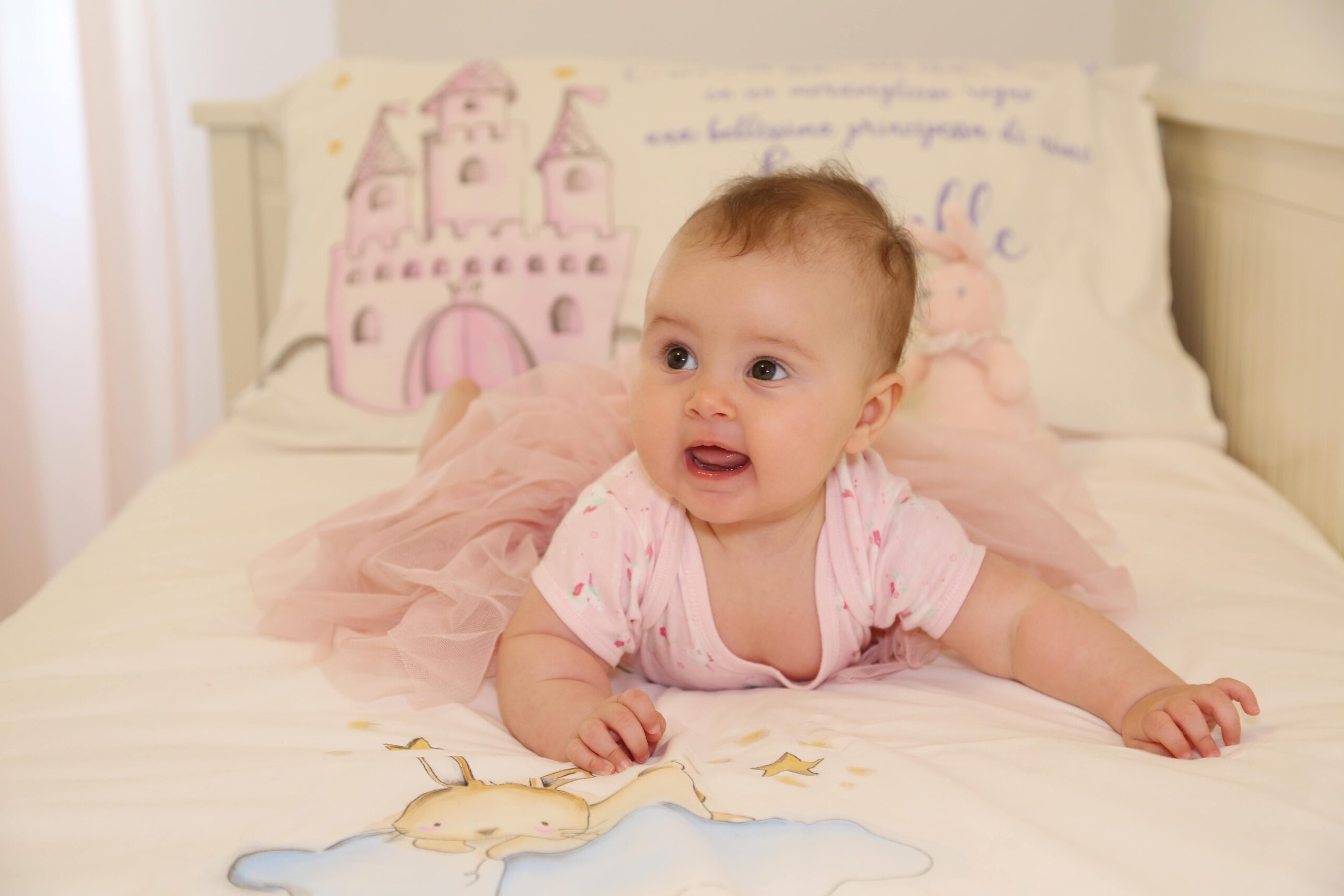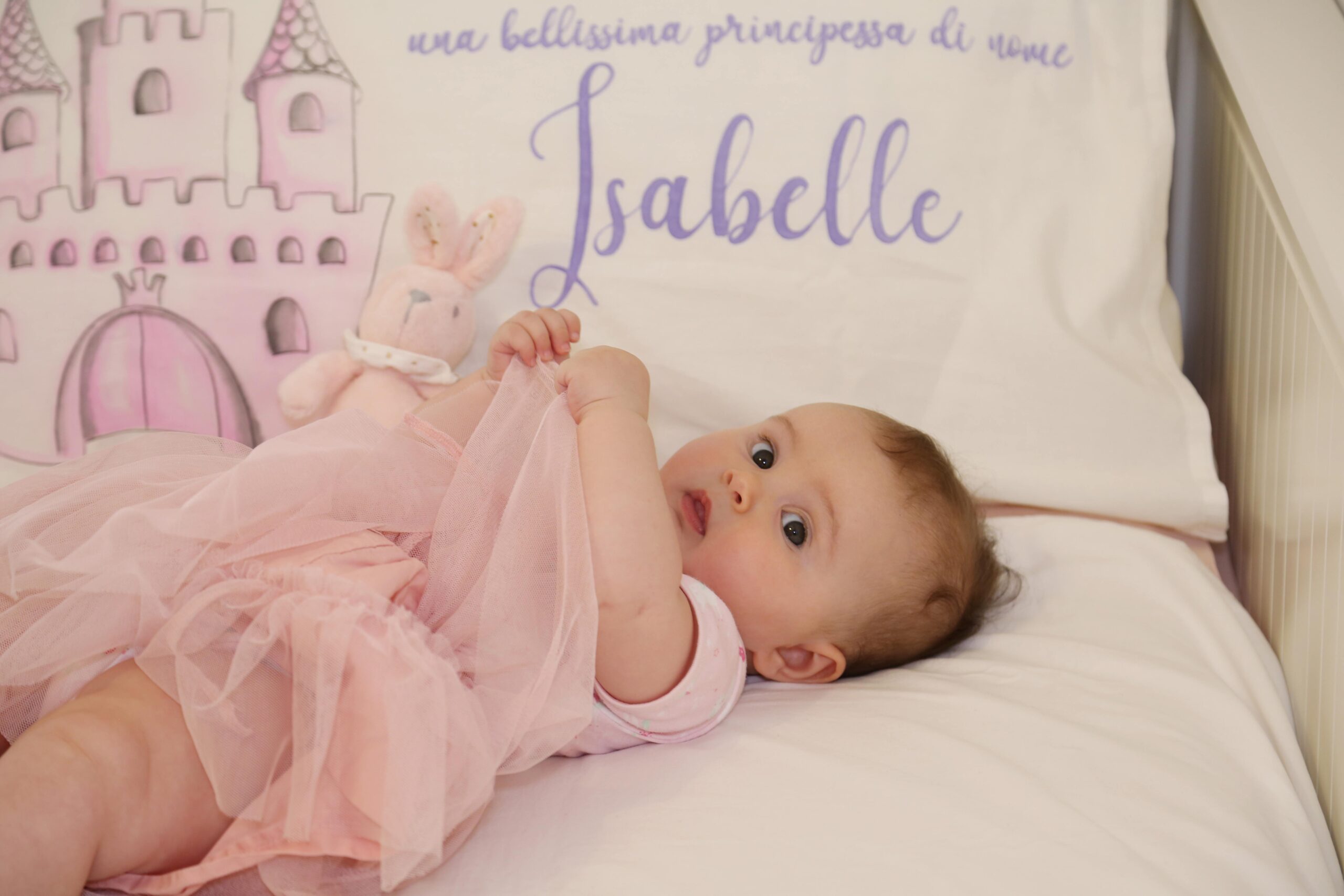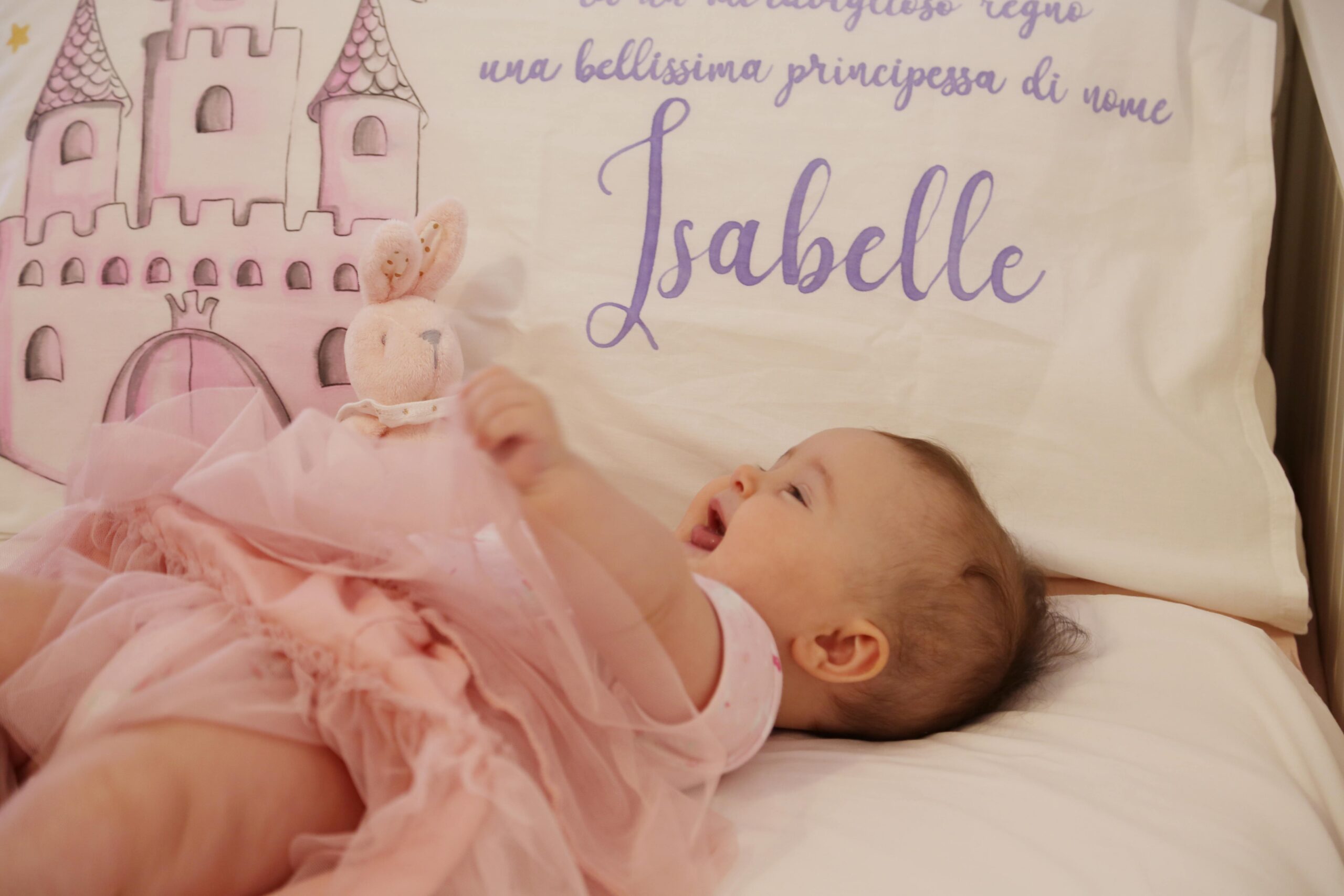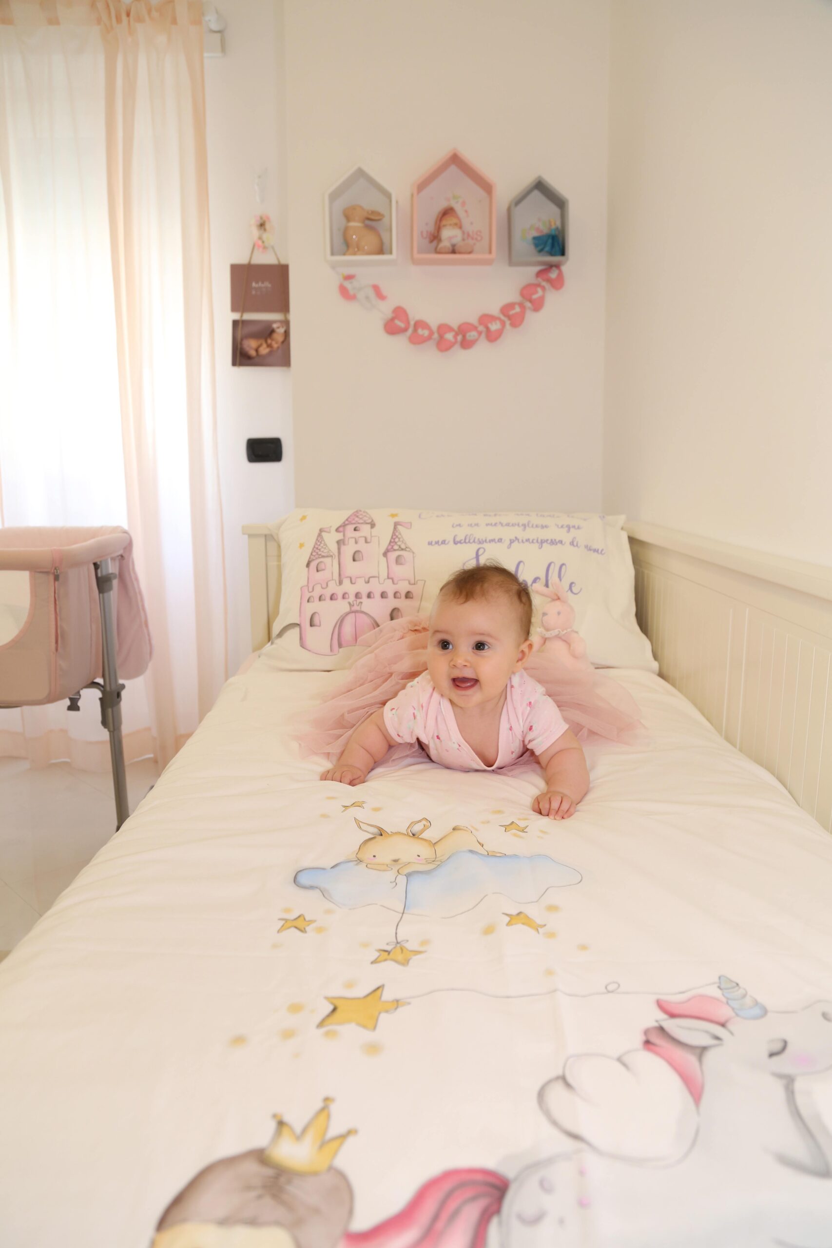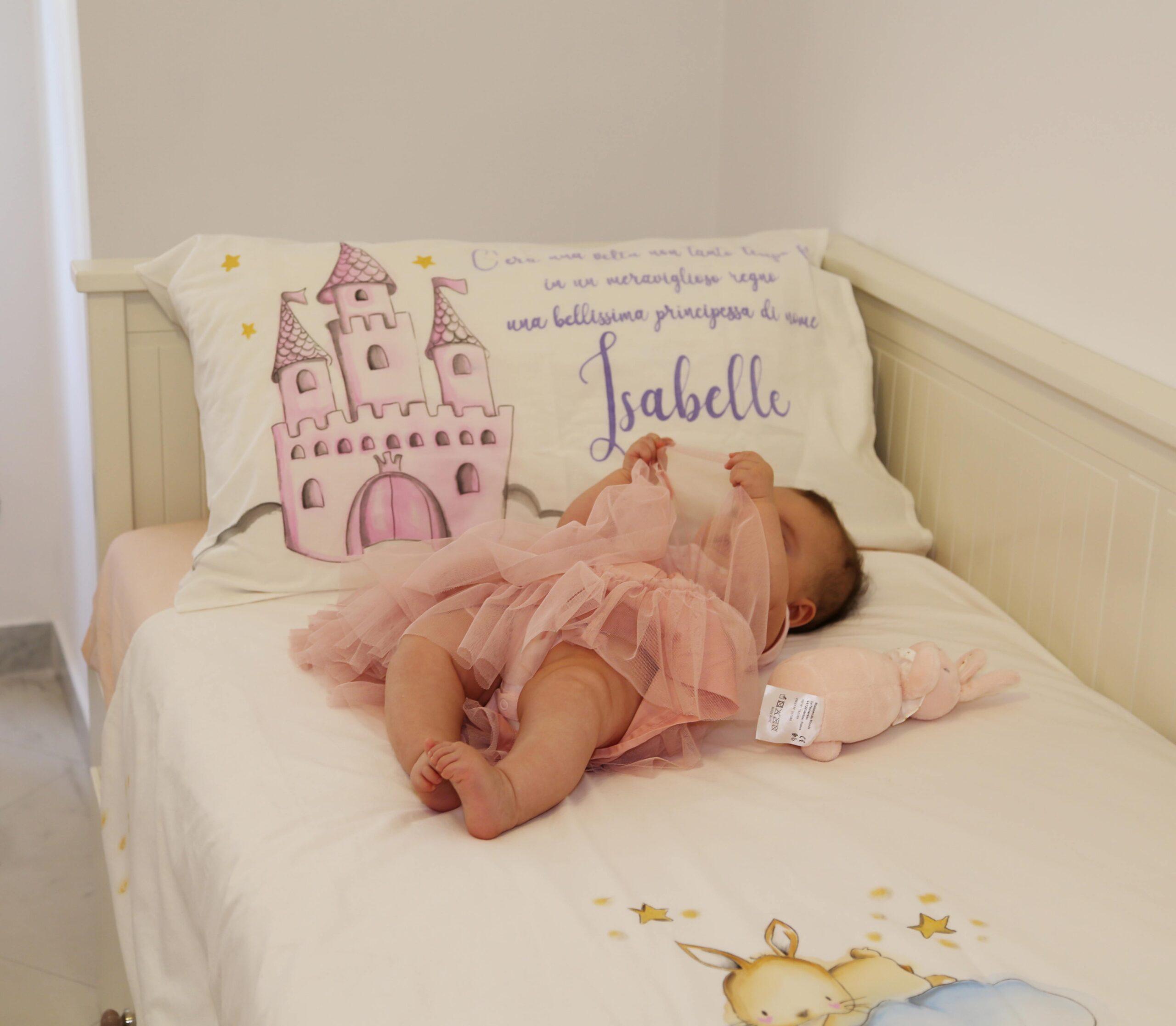 In questo momento sul lettino della cameretta della mia piccola c’è un suo lavoro, un bellissimo lenzuolo dipinto a mano con uno dei temi più amati dalle bambine ” Le principesse”, dove la protagonista è la mia sorridente Belle.