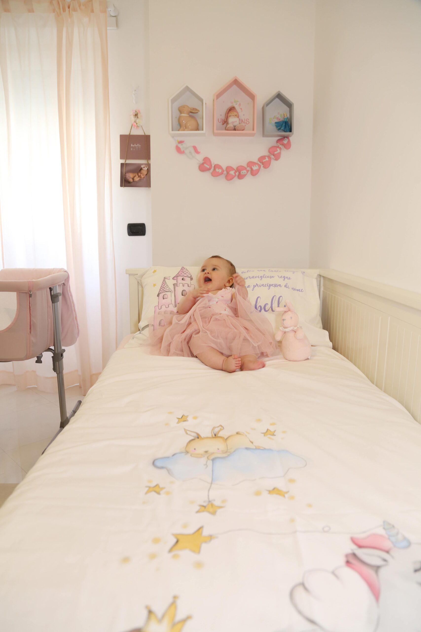 Inutile dirvi che il tema del lenzuolo rispecchia perfettamente il mood della piccola cameretta che io e Francesco stiamo creando pezzettino dopo pezzettino, tra la scelta del lampadario personalizzato con le stelline in feltro che ho cucito gli ultimi mesi di gravidanza, le dolcissime foto new born del primo shooting fatto a 15 giorni di vita, il quadretto di AccioSmile che ritrae la mia bellissima famiglia ed i tanti coniglietti sparsi qua e là.