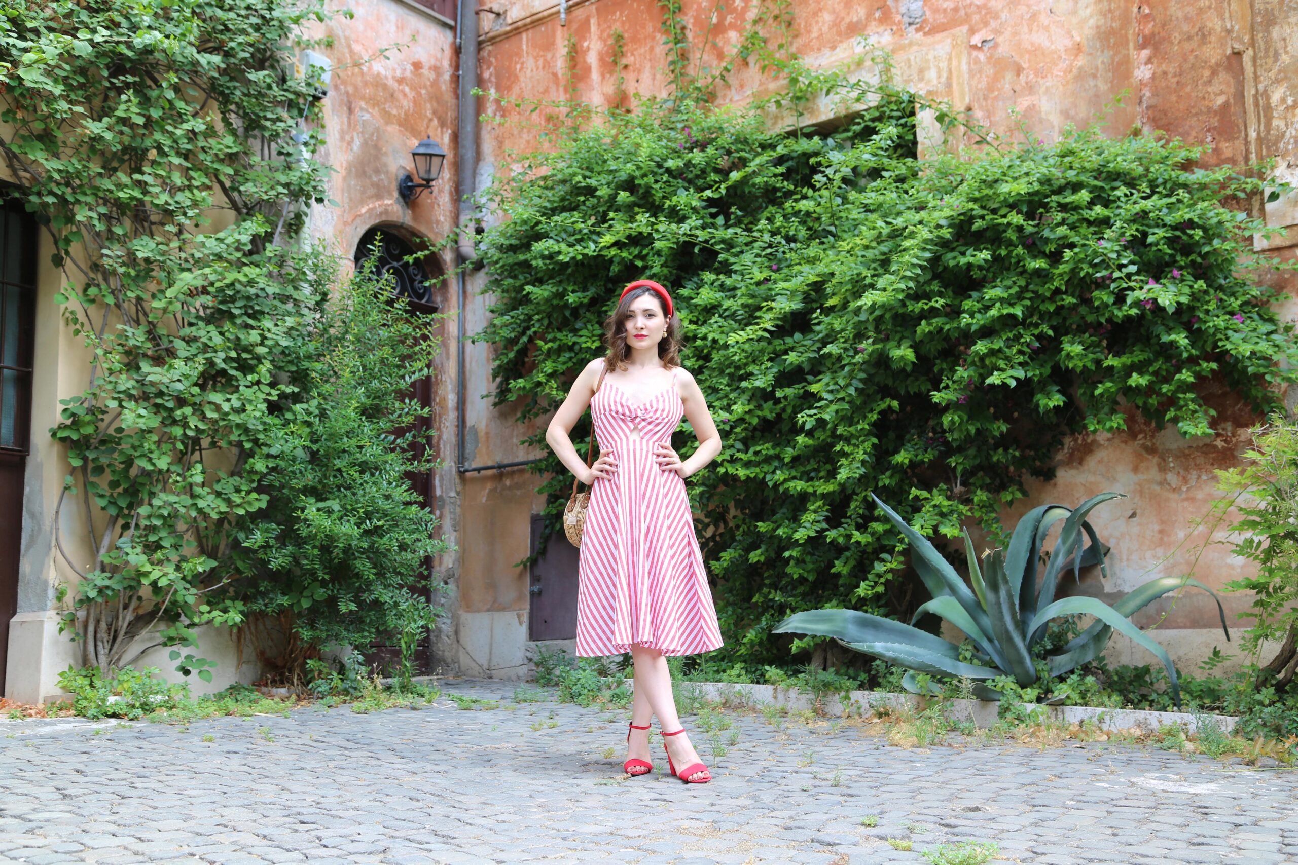 Per l’occasione ho indossato un vestito a righe bianche e rosse di SheIn, lunghezza midi svasata. L’ho abbinato ad una borsa tonda di paglia con dettagli in ecopelle, che trovate su Asos (in saldo da qualche giorno) e per completare il look in perfetto stile anni ’50 ho abbinato anche un cerchietto bombato, come suggerisce la moda in questo periodo. Il vestito è in fresco cotone 100%, lascia la schiena scoperta, ha un bello scollo profondo e bretelline sottili (che amo), ideale per queste giornate caldissime. Ed allo stesso tempo è originale. Lo scelgo sempre quando voglio essere carina senza patire troppo l’afa estiva di Roma (da questo punto di vista penso che sia stata l’Estate più calda di sempre della mia vita).